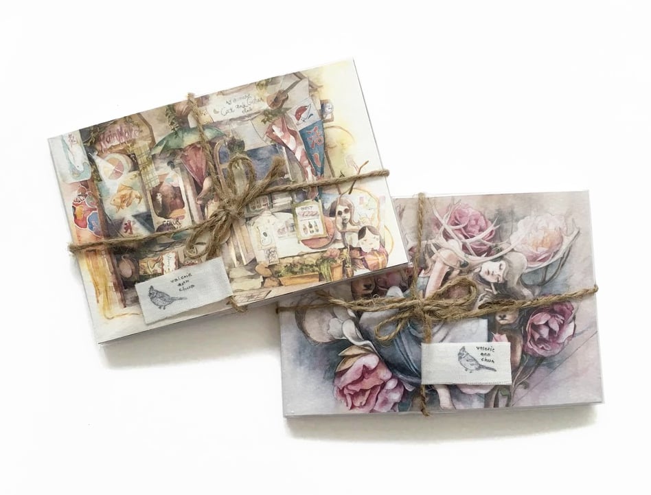 A set of 10 postcards with assorted watercolor works from Valerie Chua's illustration portfolio. Postcards are printed on 250gsm cardstock with watercolor paper texture using high quality inks.
